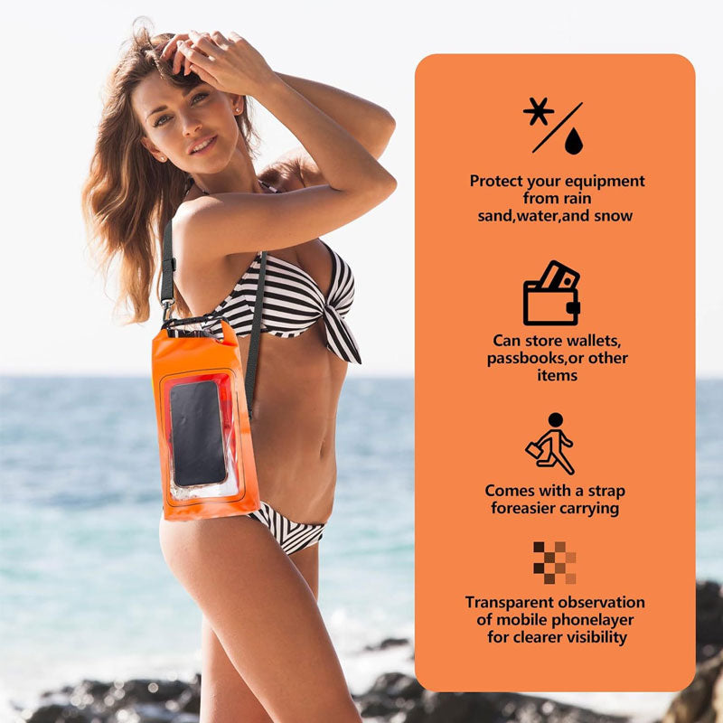 Transparent telefonväska: Håll dig uppkopplad även i vattnet med den genomskinliga telefonväskan som tillåter smidig pekskärmsfunktion. Påsen rymmer smartphones upp till 7 tum, så att du kan ta bilder, kolla meddelanden eller navigera på kartor utan att ta bort telefonen ur väskan. 📱💦