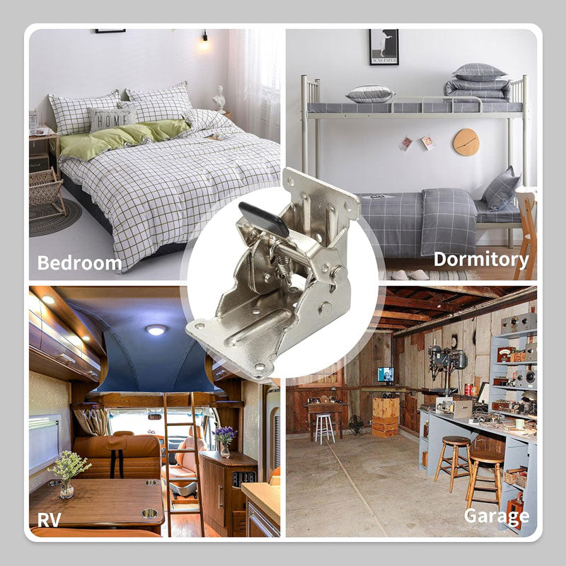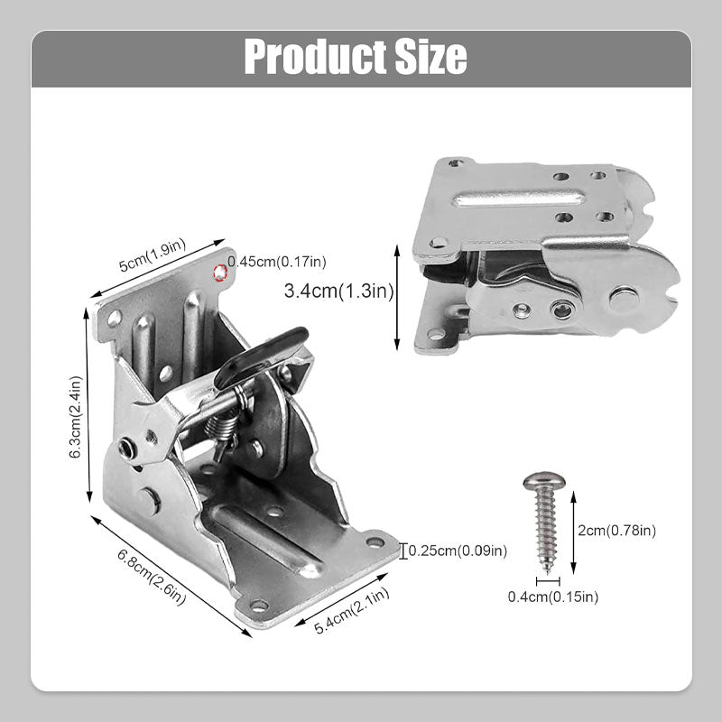 Självlåsningsfunktion: För att öka säkerheten har dessa fästen en fjäderaktiverad självlåsningsfunktion som kan fixeras genom att låsa i öppet läge. När du inte använder ett skrivbord eller arbetsbänk, klicka bara på spärren och fäll ner den för att få mer utrymme.