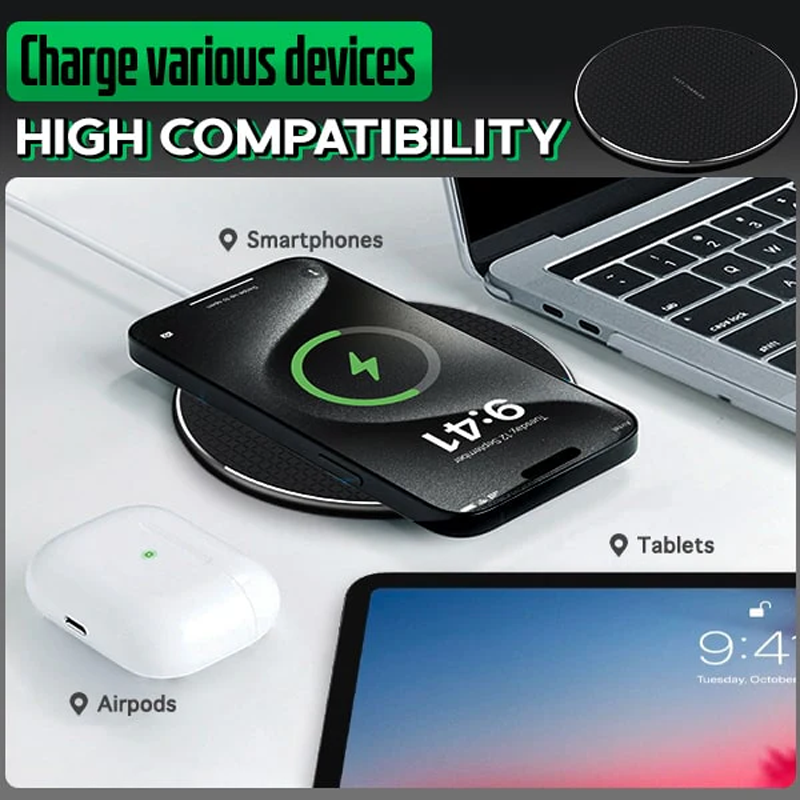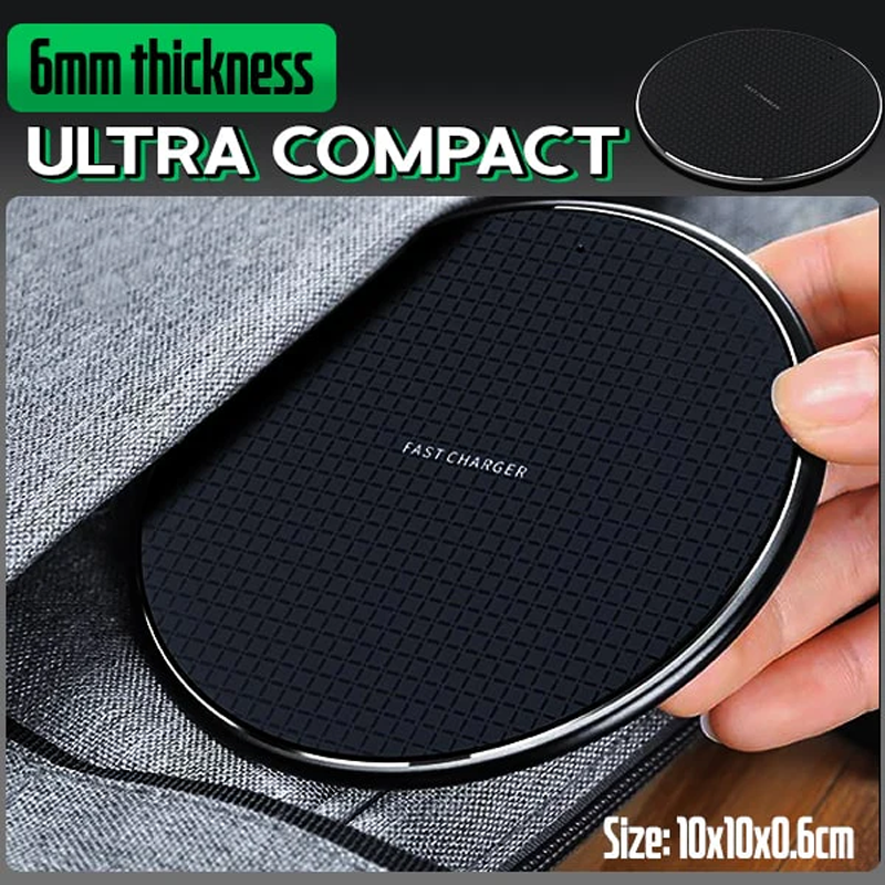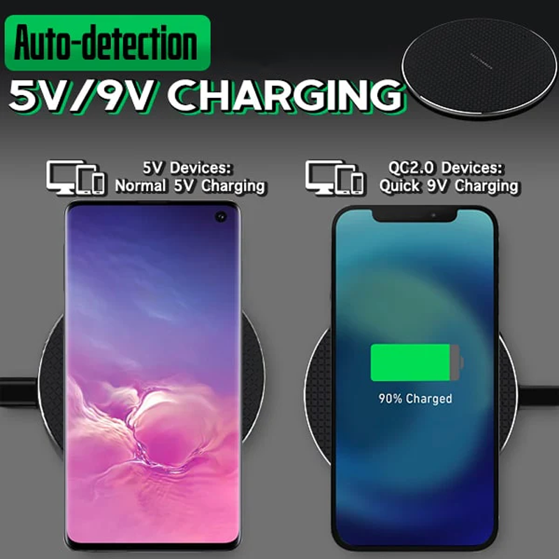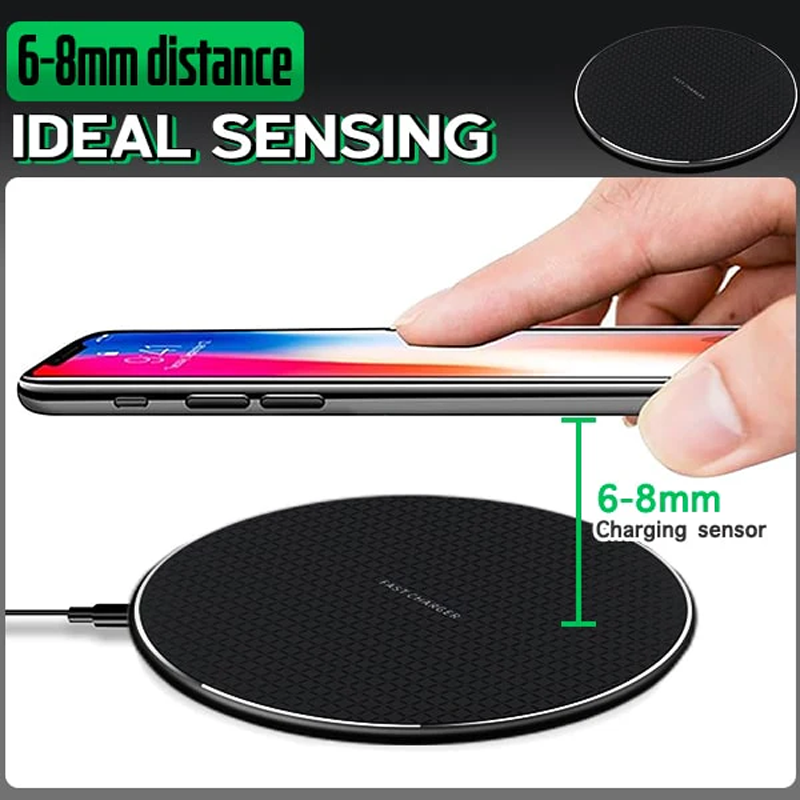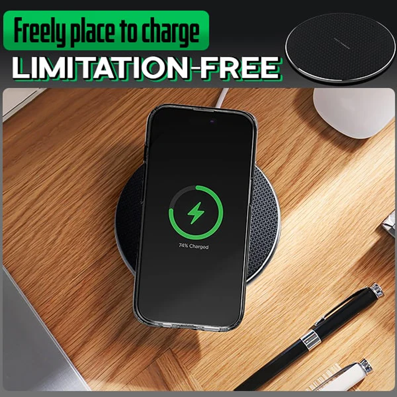 En smart cirkulär laddningsplatta som använder en avancerad elektromagnetisk induktion för att framgångsrikt överföra energi direkt från din enhet. Så att du säkert och snabbt kan strömförstärka utan besvären med att koppla in en kabel och ansluta den till en telefonport som bara avvecklas stökigt varje gång. Anslut bara laddaren först, placera din mobil platt på plattan för att slå på och du är klar. Denna trådlösa pad har en uppgraderad inbyggd kopparspole för en mycket bättre och större avkänningsområde för att få det bekväma 360°-laddningsläget. Det gör att du fritt och utan ansträngning kan släppa ner din mobil horisontellt, vertikalt, vinklat och annan placering utan att bli oladdad.