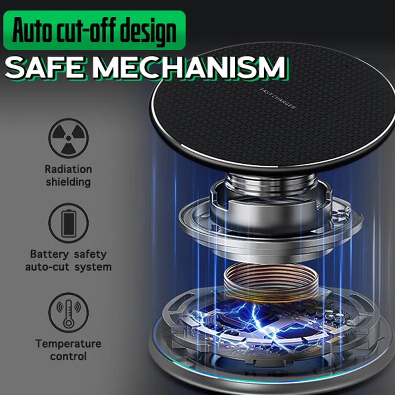 Denna trådlösa snabbladdningsplatta stöder ett säkrare intelligent skydd som konsekvent laddas och automatiskt stoppas när den är fullt förstärkt. Förhindra risken att få din mobil från överhettning, överladdning, överström, överspänning och sådant. Det orsakar inte heller några skadliga störningar på dina telefonkomponenter och kommer snabbt att indikera ett blått ljus när det känner av metallföremål. Idealisk speciellt för dem som alltid placerar eller släpper nycklar, smycken, nyckelringar, mynt och annan metall på dynan. Tillverkad med den bästa trådlösa laddningstekniken och materialen som ståtar med att hålla i flera år utan att skada eller försämra prestanda.