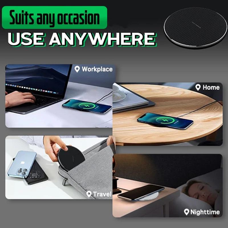 Har hög tillämpbarhet som kan överensstämma med 30W, 20W, 15W och 10W mobilladdningskapacitet. Det kan också förstärka olika smarta enheter från olika märken från senaste till äldsta modelltyper. Lämplig för iPhone 14, 13, 12, 11, XR, XS max, X, 8 Plus, Samsung Galaxy S23, S22, S21, S20, S10, S9 och så vidare. Du kan till och med använda den för att smidigt ladda även med dina mobilfodral på så att du inte behöver ta bort hela tiden varje gång du får ett lågt batteri. Dessutom är den trådlösa laddningsplattan bekvämt tunn och kompakt så att den enkelt och snyggt kan förvaras i väskor utan att ta upp plats. Gör den till en praktisk laddare hemma eller när du är ute på jobbet, kontoret, semestern, hotell, sovsalar, affärsresor och fler möjligheter.