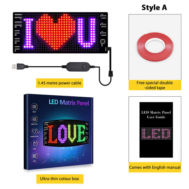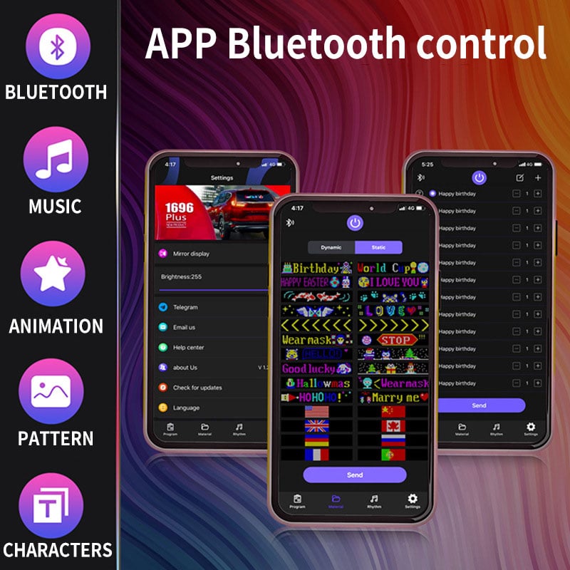 Anslut bara USB till en strömkälla, använd appen på din Apple- eller Android-enhet, anslut via Bluetooth och lås upp en värld av funktioner. Rita fritt, fritext, ladda upp dina egna bilder eller GIF:er, men här är kickern: Vår app har ett onlinebibliotek fyllt med massor av GIF:er. Föreställ dig att kryssa nerför gatan med de coolaste GIF-bilderna i universum – din bil kommer att stjäla rampljuset som aldrig förr!