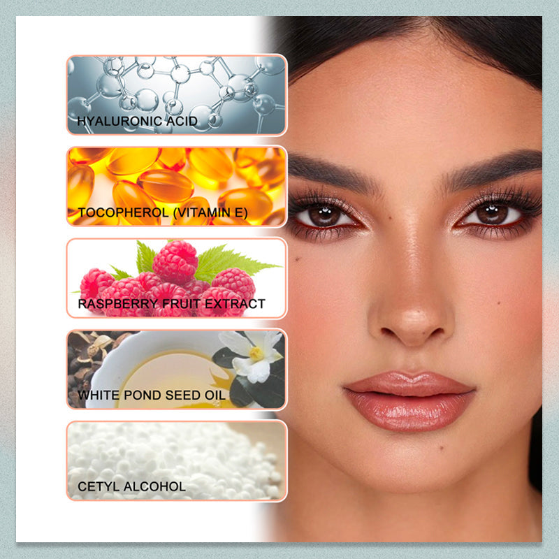 - Ingredients: Water, Hyaluronic Acid, Tocopherol (Vitamin E), Raspberry Fruit Extract, White Pond Seed Oil, Cetyl Alcohol