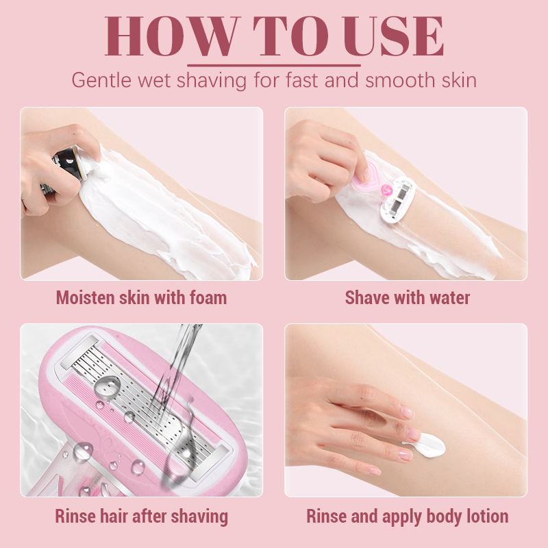 2️⃣Mjukt våt rakning: Fukta rakhuvudet med vatten och glid det försiktigt över huden i hårets tillväxtriktning. Använd lätta tryck och korta drag för att ta bort håret effektivt samtidigt som du minimerar irritation. Skölj rakhuvudet ofta under rakning för att ta bort all ansamling och säkerställa en ren rakning.