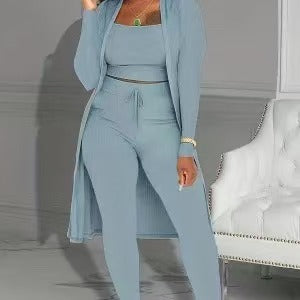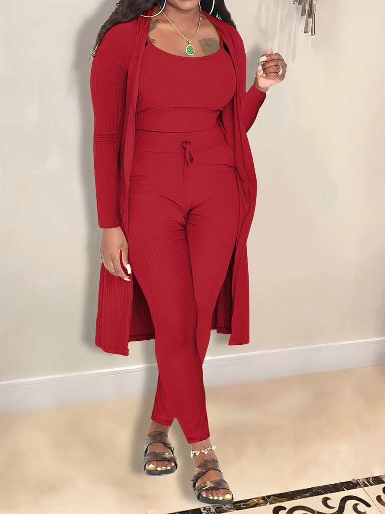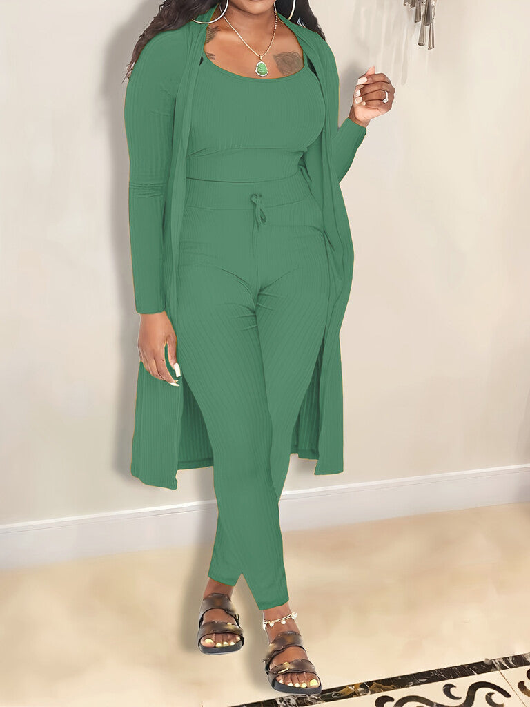 3-DELAT KOORDINERAT SET: Detta 3-delade set innehĂ„ller en kort ribbad linne, en lĂ„ng kofta och Ă„tsittande byxor â alla designade för att passa perfekt ihop. SĂ€g adjö till stressen med att hitta rĂ€tt outfit; detta set erbjuder en komplett look som enkelt kan övergĂ„ frĂ„n avslappnad hemmaklĂ€dsel till lĂ€ttare utflykter.