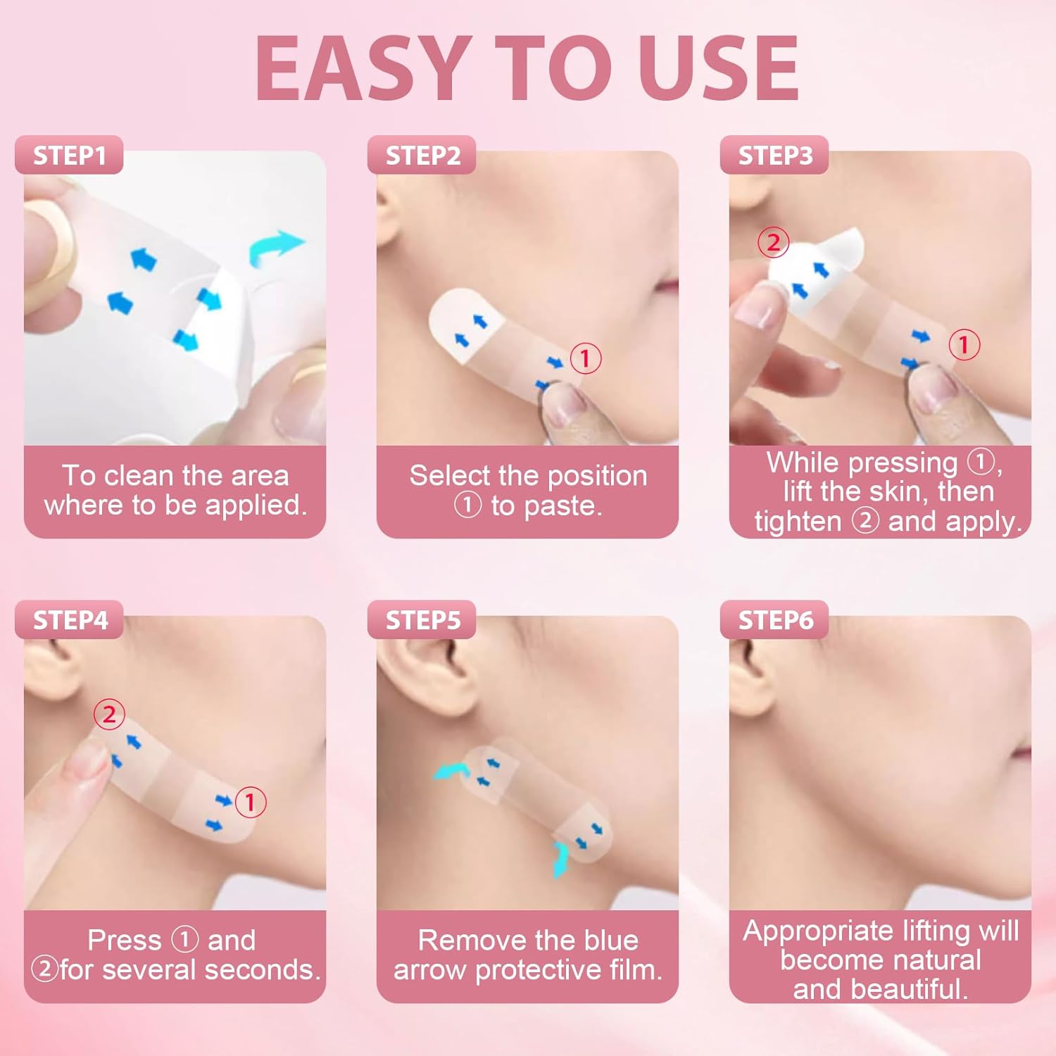 âŁïžăEasyytouseă Placera bara ena Ă€nden av ansiktslyftningstejpen pĂ„ huden, dra sedan huden 1 - 2 tum bakĂ„t och tryck fast uppĂ„t för omedelbara resultat! Se till att ditt ansikte Ă€r fritt frĂ„n smink eller olja innan du applicerar ansiktslyftningstejpen osynligt. Som en vĂ€nlig pĂ„minnelse kommer det att göra lite ont nĂ€r du drar av den, sĂ„ du kan vĂ€rma upp den eller mjuka upp den med en sminkborttagare innan du tar bort den.